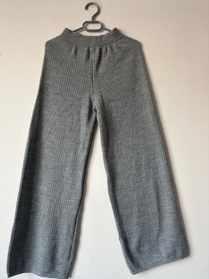 Gri örgü yün pantolon, bol kesim ile rahat ve günlük kullanıma uygun tarz sunar. Lastikli bel esnek kumaş.