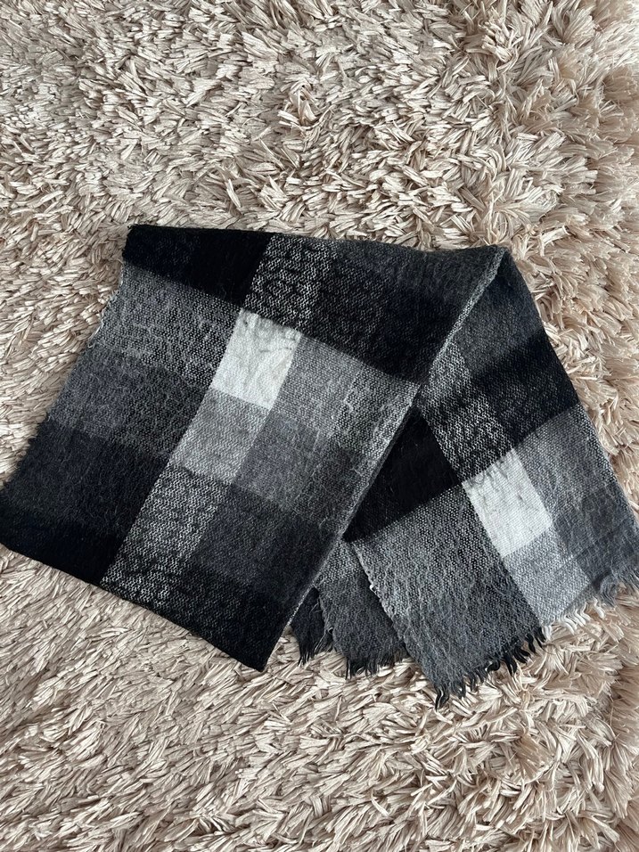 Gri örgü yünden yapılmış, çağdaş kare desenli, rahat ve temel tarzda kadın şalı.