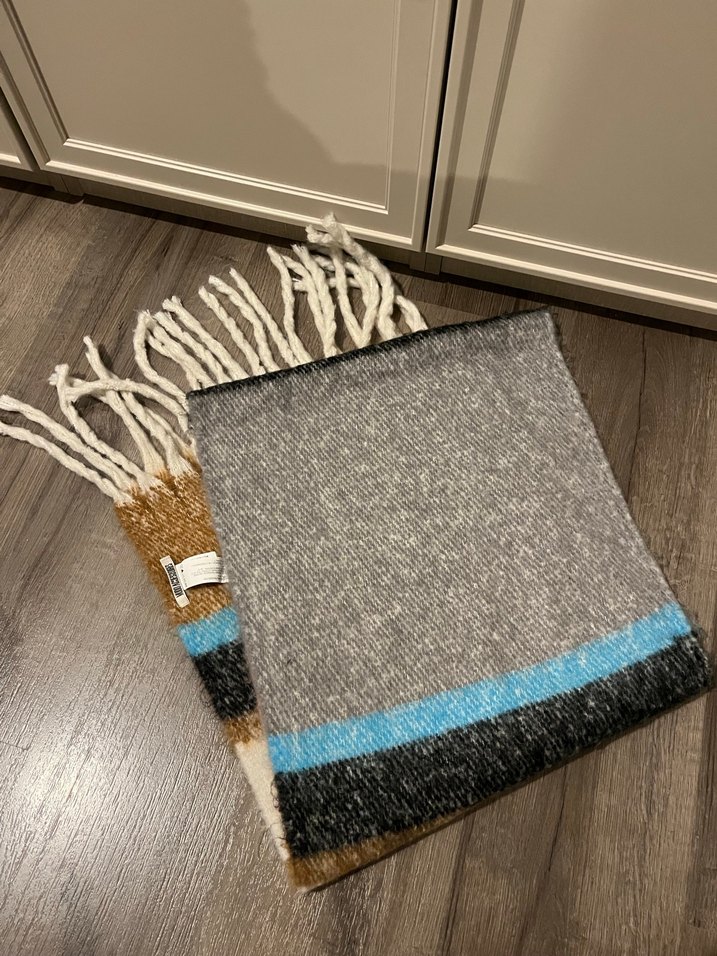 Renkli çizgiler ve püsküllü kenarlarla örülmüş gri yün şal, bohem tarzı için uygundur.