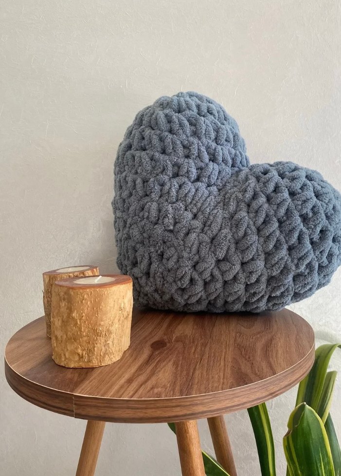Gri renkli, kalp şeklinde, kalın örgü desenli el yapımı dekoratif yastık. ️