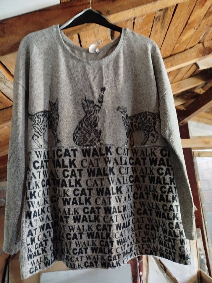 Gri örgü kumaştan, kedi desenli ve 'CAT WALK' yazılı baskıya sahip street wear tarzında kazak.