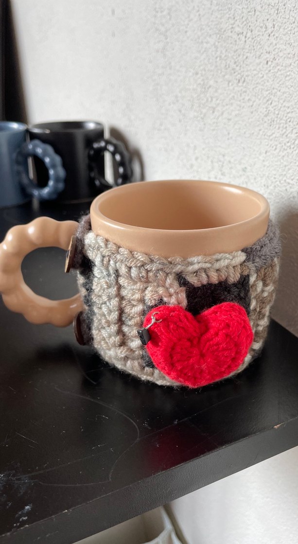 Dokulu saplı gri seramik kupa, kırmızı kalp detaylı örgü kılıfla sarılı. Sıcak içecekler için uygun. ☕️