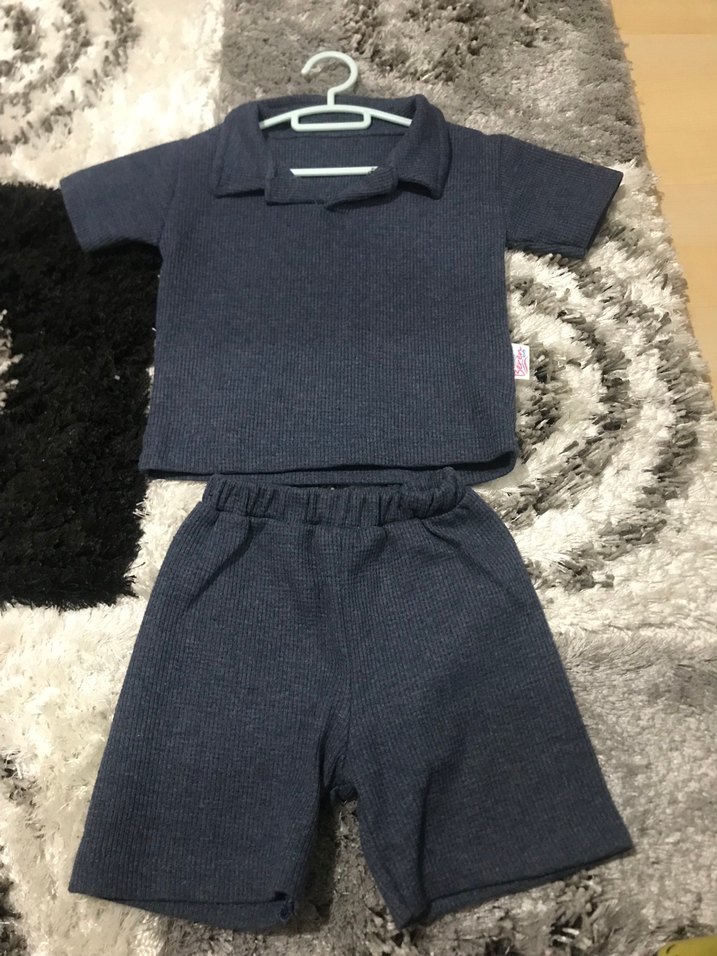 Gri renkte, örgü dokulu kısa kollu, yakalı üst ve şorttan oluşan, yumuşak ve sıcak kumaştan bebek takımı.