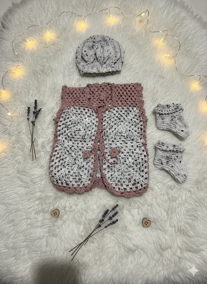 Gri renkte, desensiz, örgü kız bebek takımıdır. Kolsuz yelek, şapka ve çoraptan oluşur, yumuşak dokuludur.