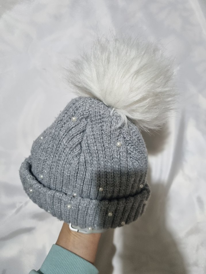 Gri örgü kadın bere, inci detayları ve üstte beyaz tüylü ponpon ile sıcak ve şık bir görünüm sunar. ❄️