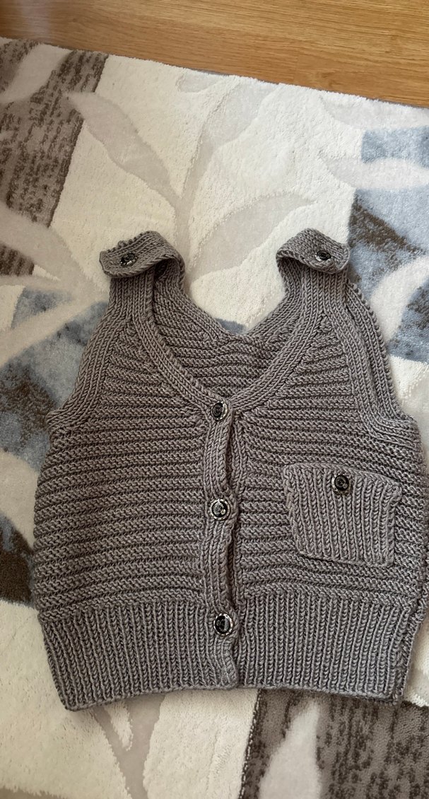 Gri renkli, yakalı ve düğmeli detaylı, kolsuz örme süveter. Rahat kesim ve mini boyda, önünde küçük cep bulunur. Günlük sokak stili için uygundur.