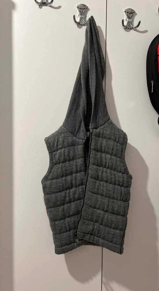 Yumuşak keten kumaştan, örgü dokulu, yüksek yakalı, kolsuz gri kadın yeleği. Günlük kullanıma uygun, midi boy ve vücuda oturan kesim.