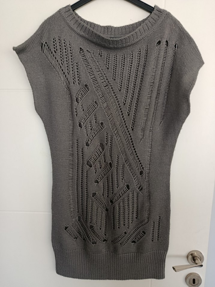 Kolsuz, gri örgü elbise bisiklet yaka ve vücuda oturan kesimle. Açık örgü desenleriyle çağdaş tasarım. Midi boy, günlük kullanım için uygun. koltuk altı ölçüsü 59 cm boy 87 cm tunik veya elbise olarak kullanabilirsiniz