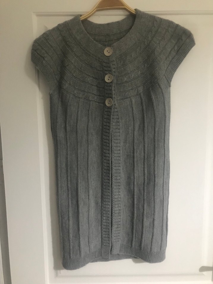 Füme gri renkte, düğmeli, kolsuz ve midi boy örgü hırka.Yuvarlak yakalı ve rahat bir tarz sunar.