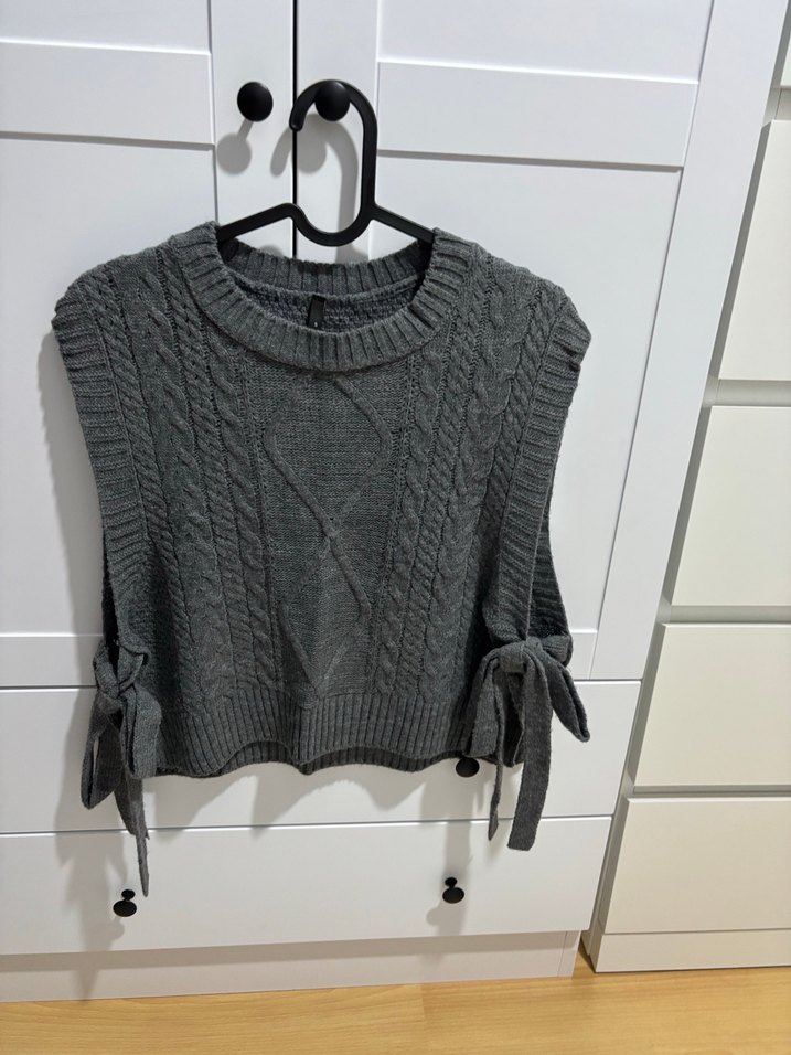 Gri renkli, örgü dokulu, kolsuz ve kısa kesim kadın süveter. Yuvarlak yakalı, yanlarda bağcık detaylı, rahat ve şık bir parça.
