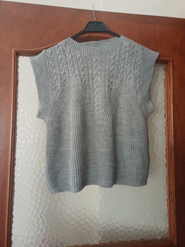 Gri renkli, kolsuz, örgü dokulu, yuvarlak yaka ve bol kesim kısa uzunlukta kadın süveter. Günlük rahat kullanım için uygundur.