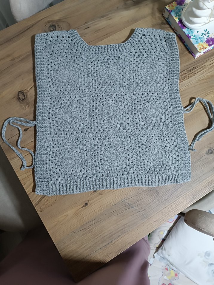 Gri renkli, kolsuz, kısa boy hamile süveter. Örgü kumaştan, bol kesim ve yuvarlak yaka detaylı, rahat ve bohem tarzda, günlük kullanıma uygun.