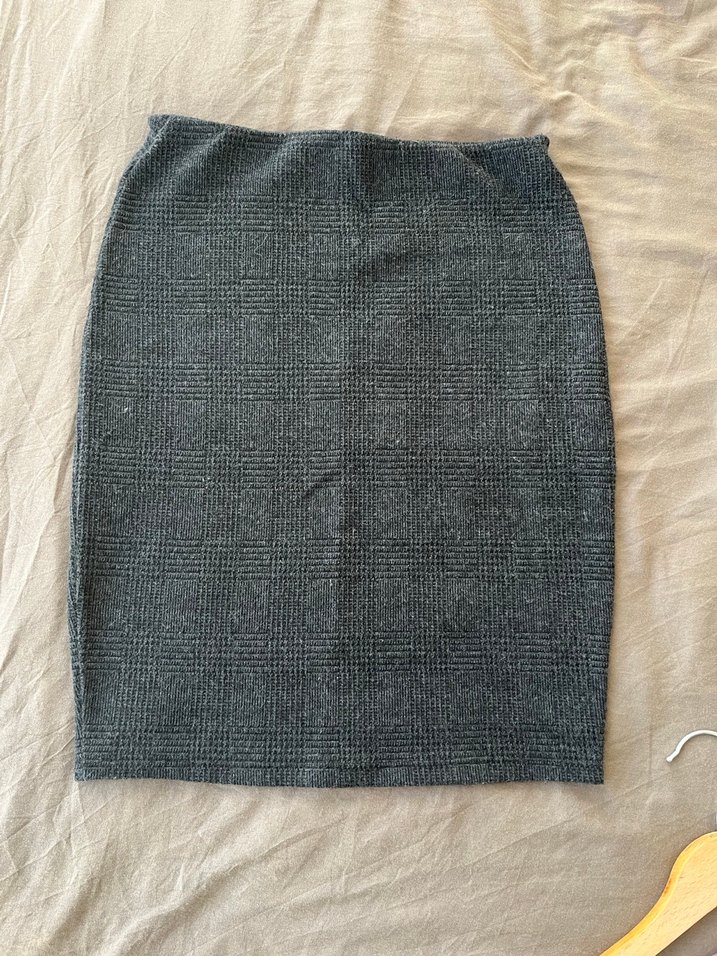 Gri renkli, sentetik kumaştan örülmüş, midi boy ve dar kesim hamile eteği. Düz ve desensiz yapısıyla ofis için uygundur.