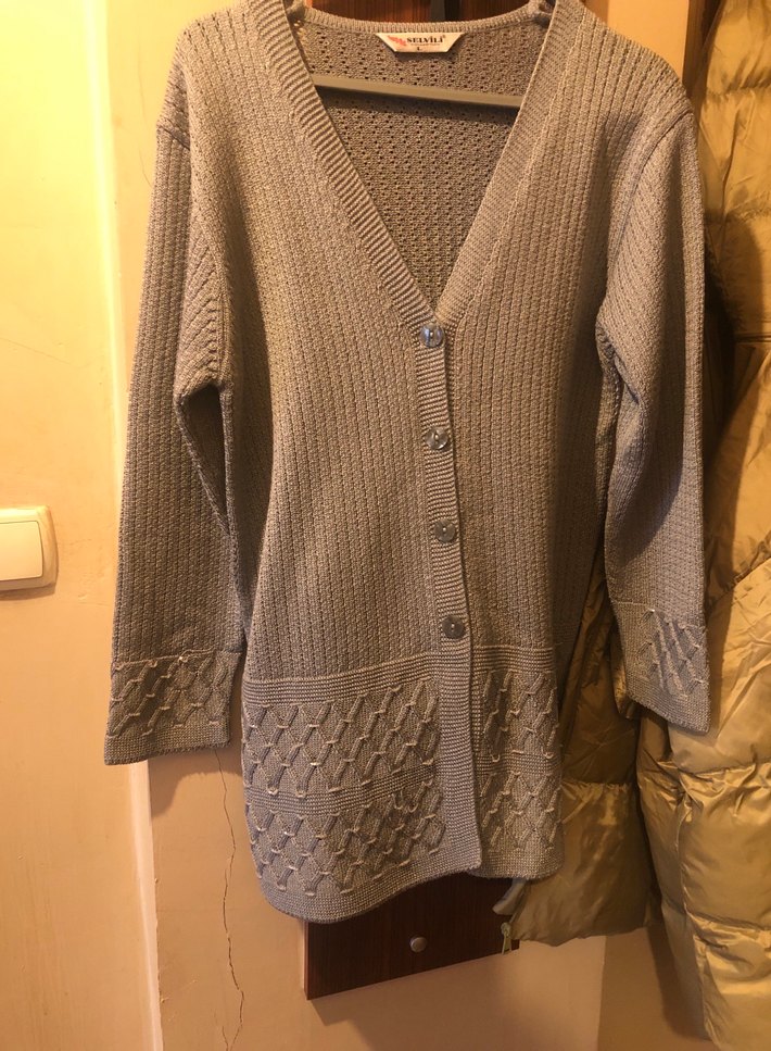 Gri renkli, örgü kumaştan yapılmış midi uzunlukta, uzun kollu ve geniş kesim bir hırkadır. Notlu yaka detayı ve sade tasarımıyla günlük kullanıma uygundur.