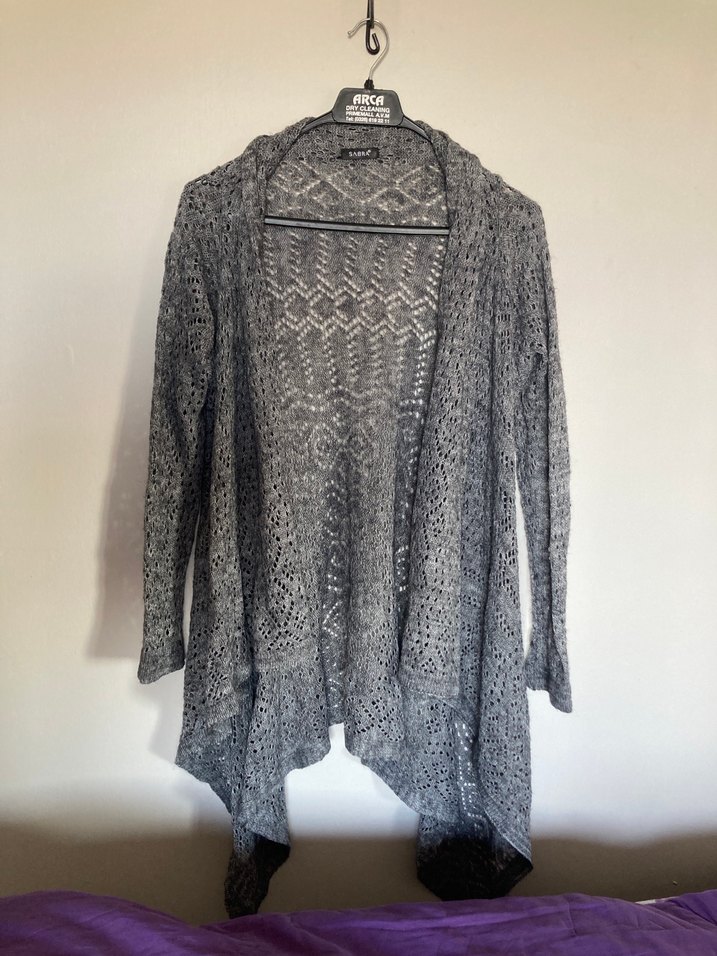 Gri renkli, örgü dokuma midi uzunlukta, bol kesim, uzun kollu ve yüksek yakalı bohem tarzda bir hırkadır. Günlük kullanıma uygundur.