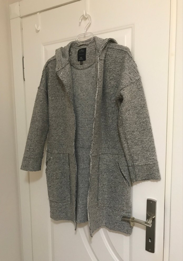 Gri yün örgü ceket, bol kesim ve uzun kollu olup, notched lapel yaka detayına sahiptir. Günlük kullanıma uygun rahat ve sokak stili görünüm sunar. Gayet iyi durumda..sıcak tutuyor