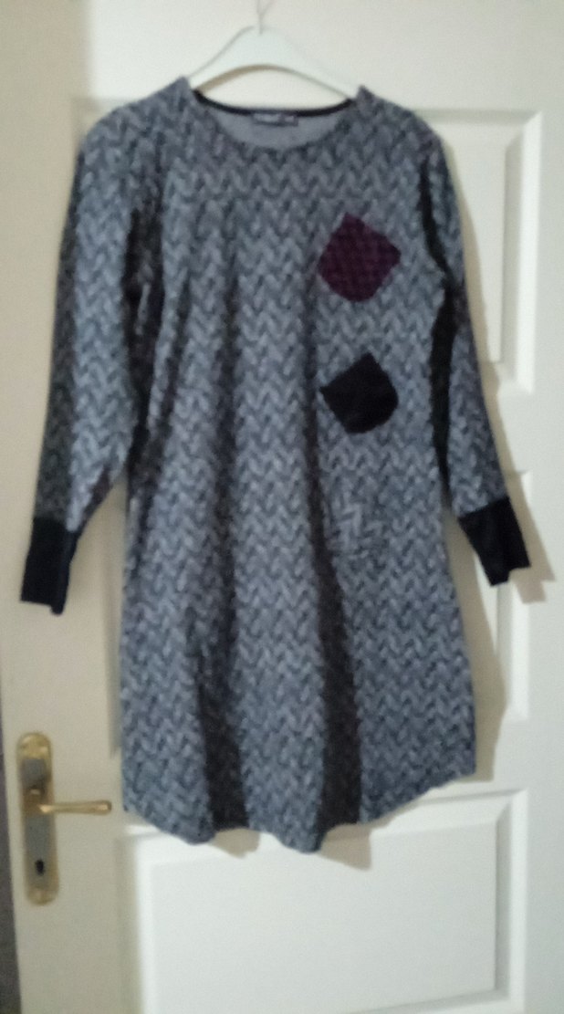 Gri renkte, örgü dokulu midi boy kadın tunik. Uzun kollu, yuvarlak yaka ve rahat bol kesimlidir. İki renkli cep detayı bulunur.
