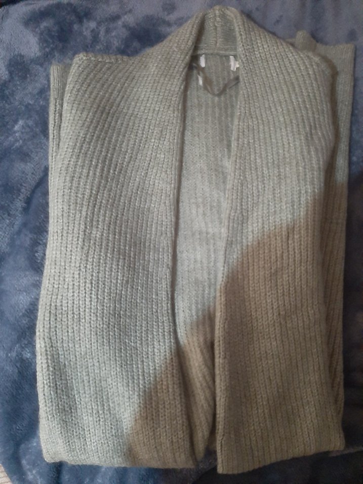 Gri renkli, örgü kumaştan, normal midi boyda, uzun kollu ve boğazlı yakalı rahat kesim kadın hırkasıdır. Günlük kullanıma uygundur. uzun boy. s m l olur