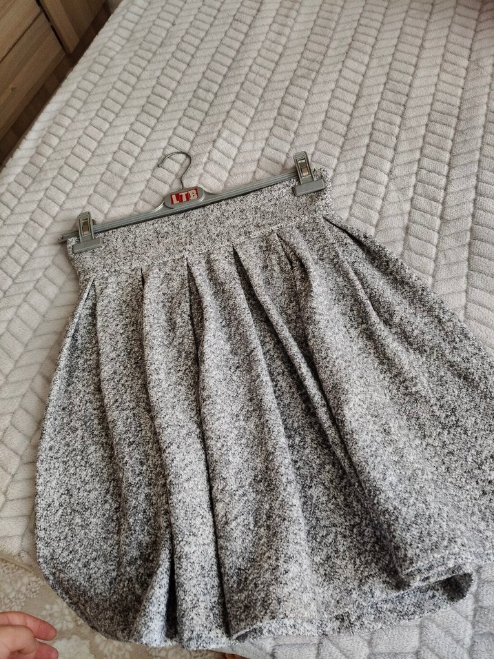 Gri renkli, mini etek, bol kesim ve rahat dokusuyla günlük kullanıma uygundur. Desensiz ve bohem tarzda bir görünüme sahiptir.