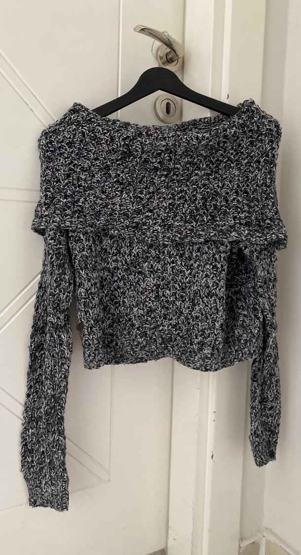 Gri renkli, örgü kumaştan yapılmış, uzun kollu, kayık yaka ve bol kesim kısa uzunlukta kadın kazak. Rahat ve gündelik tarz için uygun.