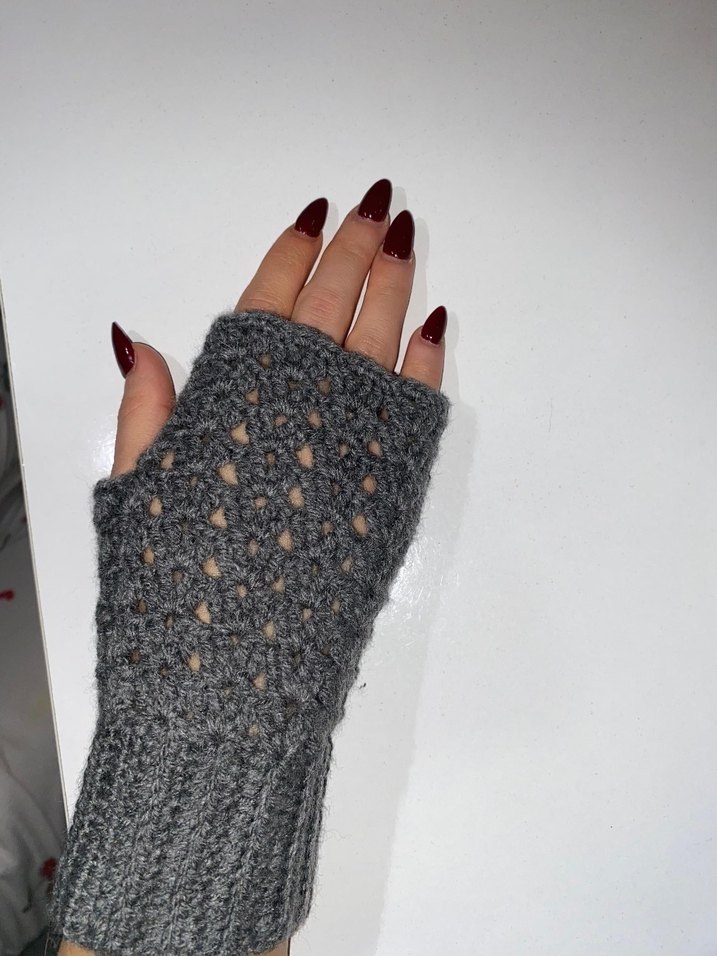 Gri renkli, örgü dokulu ve parmakları açık kadın eldivenleri, goth tarzına uygun rahat bir seçenektir.