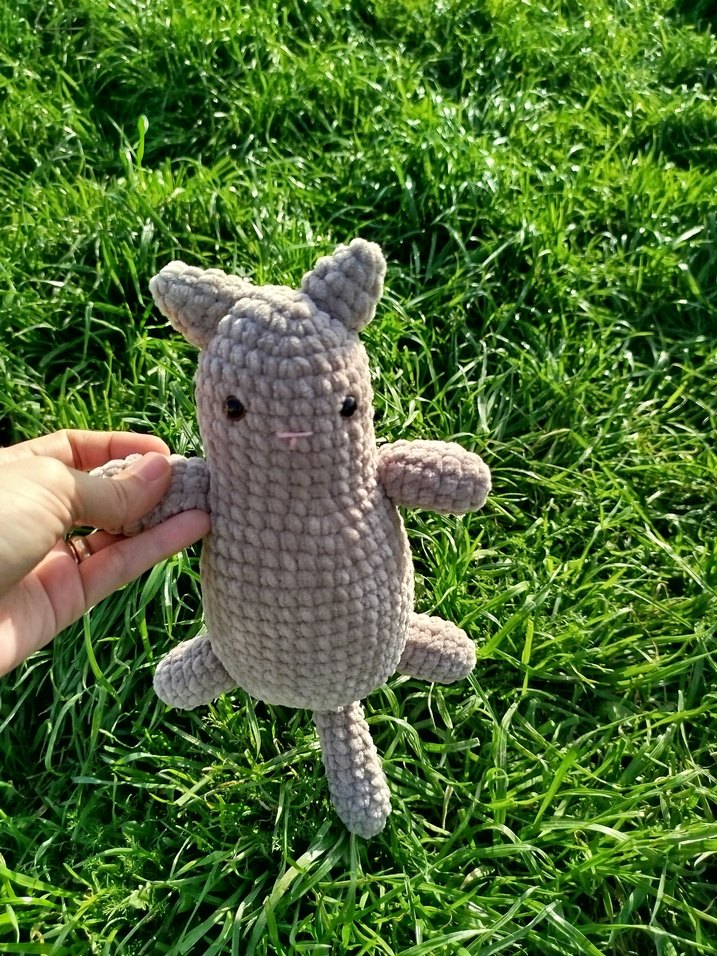 Yumuşak, gri örgü peluş kedi oyuncak, sade ve el yapımı tasarıma sahip, sarılmak için uygun.