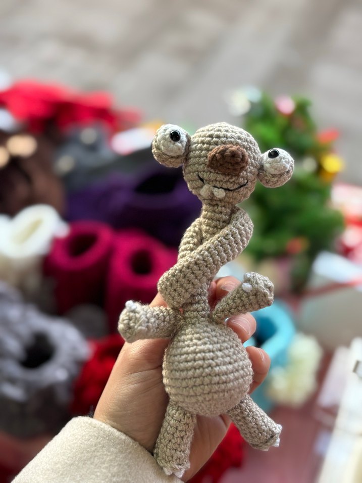 Büyük gözlere sahip gri örgü peluş oyuncak, yumuşak dokulu ve hafif.