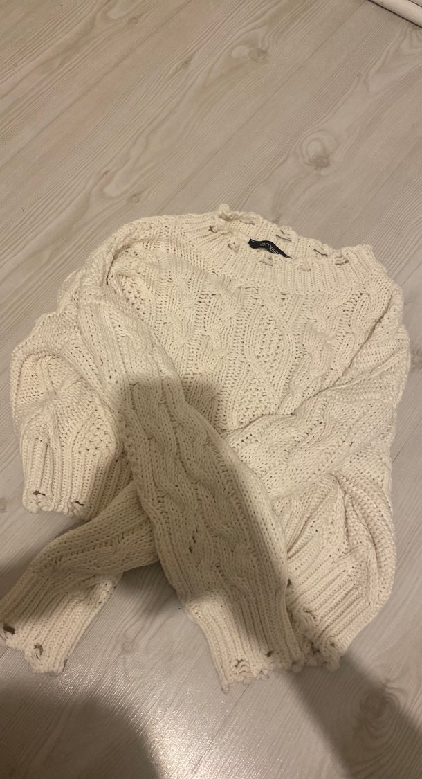 Gri renkli, örgü dokulu, salaş kesim, uzun kollu ve yuvarlak yakalı kadın kazak. Rahat ve günlük kullanıma uygun tarzda.