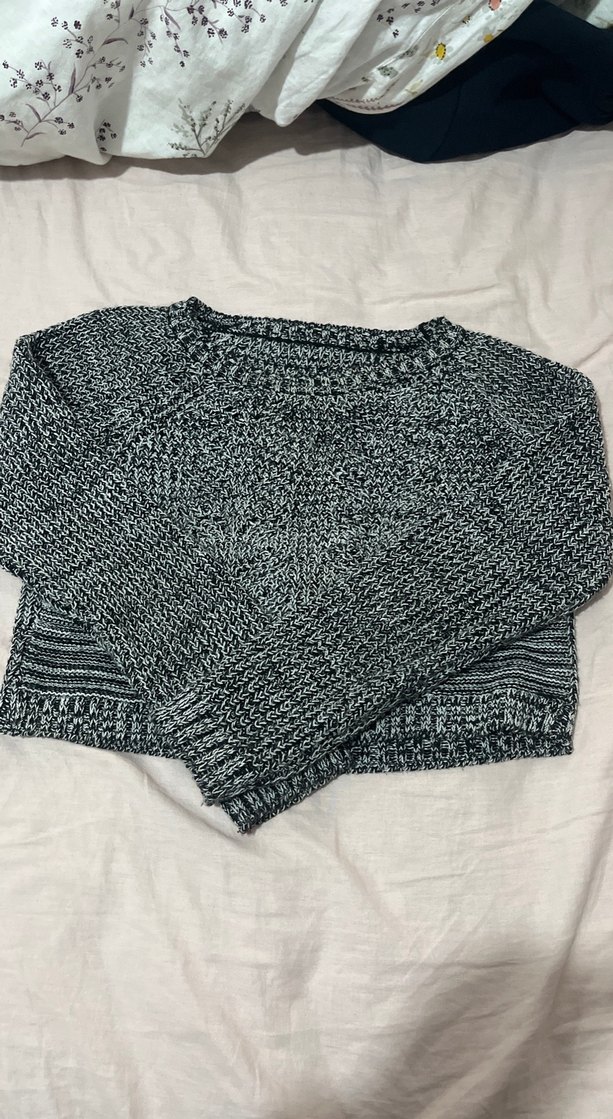Gri renkli, yuvarlak yaka ve uzun kollu örgü kadın kazak. Salaş kesim ve normal boyda, günlük sokak stili için uygundur. S M için uygun