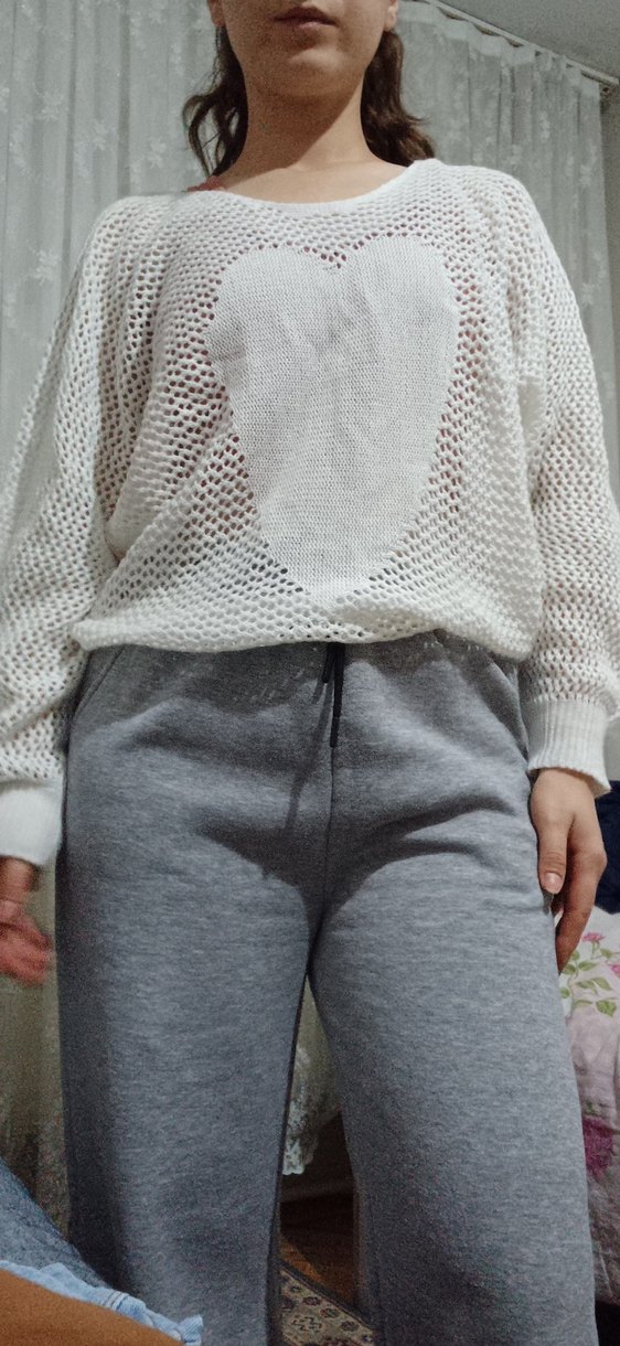 Salaş kesim, uzun kollu, yuvarlak yaka gri örgü kadın kazak. Rahat ve sıcak dokusu ile günlük sokak stiline uygundur.