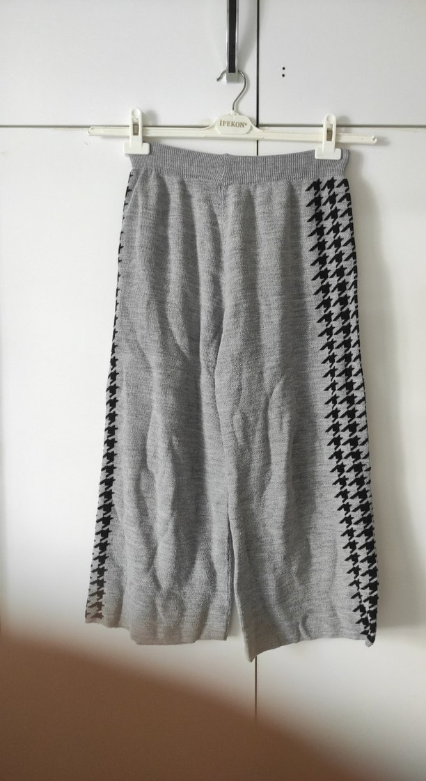 Gri renkte, örgü dokulu, yanları kazayağı desenli, salaş kesim midi boy kadın pantolon. Rahat ve yumuşak sentetik kumaştan üretilmiştir, günlük kullanım için uygundur.