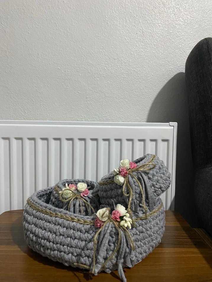 Küçük çiçek detaylarıyla süslenmiş gri örgü sepet seti, eşyalarınızı düzenlemek için uygundur.