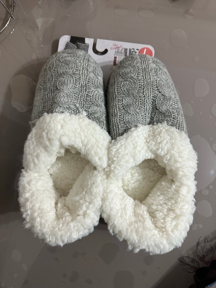 gri örgü dış yüzeye ve yumuşak, kabarık beyaz iç astara sahip sıcak ev terliği. Düz, desensiz tasarımı günlük kullanım için uygundur.