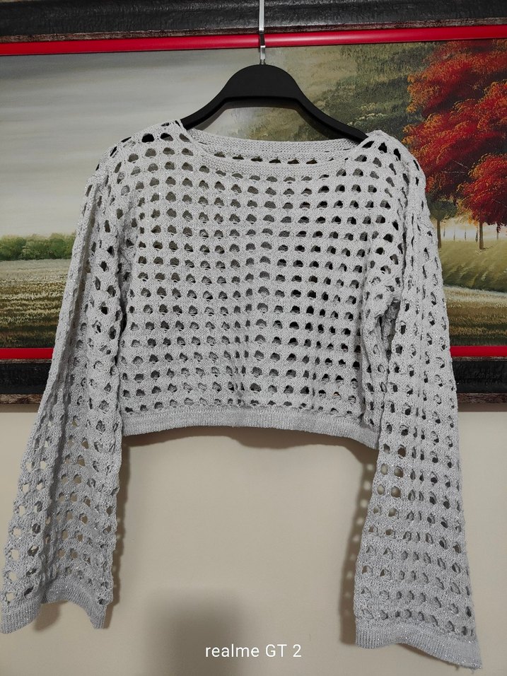 Gri simli delikli kadın kazağı, uzun kollu ve yuvarlak yakalıdır. Bol ve kısa kesimiyle bohem tarzı sunar, günlük kullanıma uygundur.