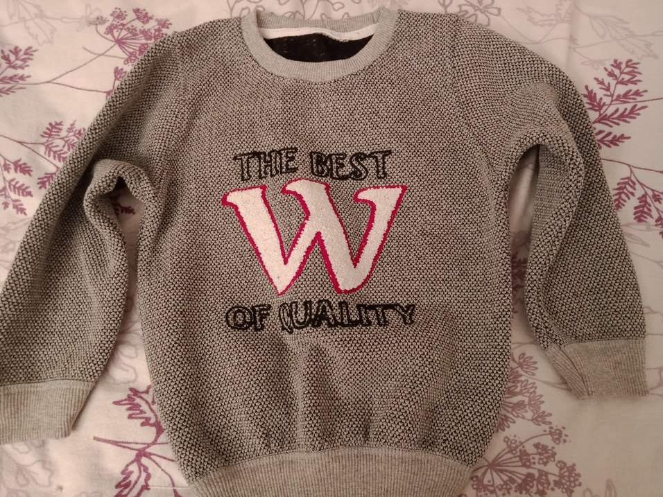 Gri renkli, örgü kumaştan yapılmış kıslk yumuşacık sıcacık sweatshirt. Yuvarlak yaka, uzun kollu ve bol kesimdir. Önünde "W, THE BEST OF QUALITY" baskısı vardır. 2 kere giyildi.