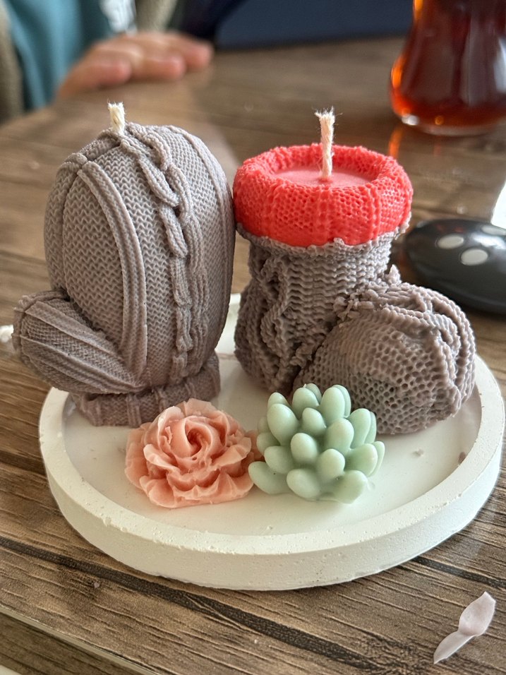Yuvarlak taban üzerinde pastel renkli dekoratif detaylar ve farklı dokularda gri örgü tasarımlı mum seti. ️