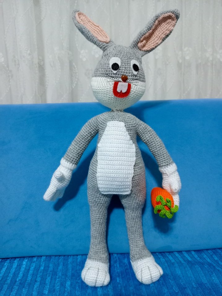 Turuncu havuç tutan, uzun kulaklı, beyaz detaylı gri örgü tavşan peluş oyuncak.