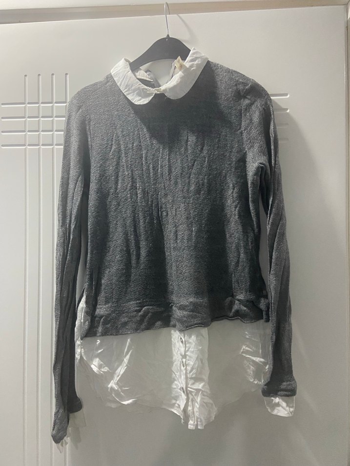 Gri örgü triko, beyaz yakalı detaylı, uzun kollu ve bol kesimdir. Keten kumaştan, günlük rahat sokak stiline uygundur.