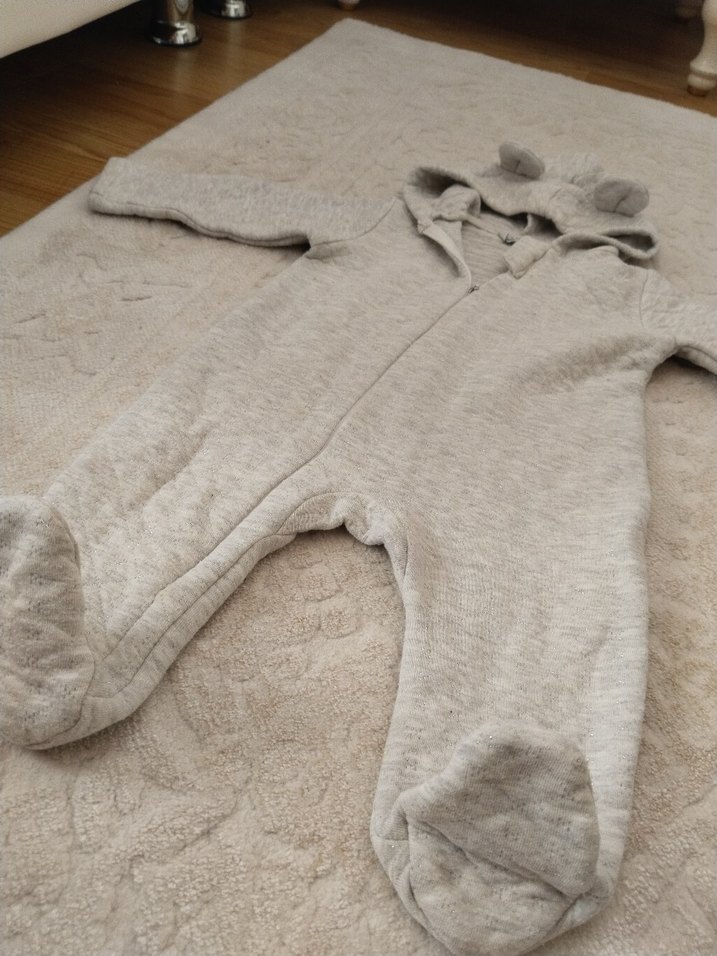 Yumuşak, sıcak kumaştan yapılmış gri erkek ve kız bebek tulumu, sevimli ayı kulaklı kapüşon içerir. az kullanılmıştir. sorunu yoktur temizdir 6 9 ay uyumlu