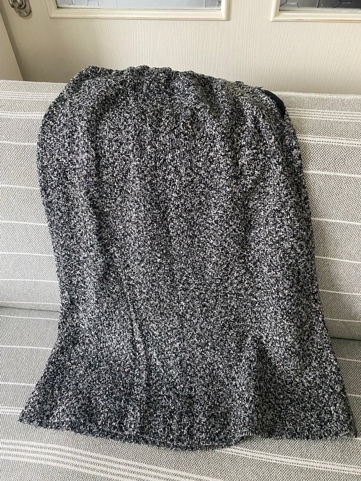 Gri renkte, örgü sentetik kumaştan yapılmış, uzun ve fitted kesim hamile eteği. Desensiz ve dış mekan kullanımı için uygundur.