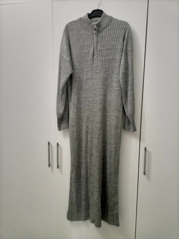 Yüksek yakalı, fermuarlı, uzun kollu ve bol kesim gri örgü uzun elbise, günlük rahat kullanım için uygundur.
