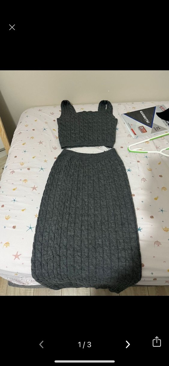 Gri renkte, straplez ve kolsuz üst ile uzun etekten oluşan fitted örgü takım. Rahat ve sıcak dokusu günlük kullanım için uygundur.