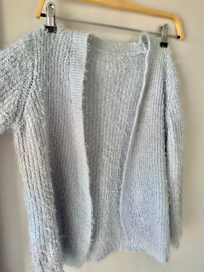 Bu gri örgü kadın hırka, bol kesimi, yuvarlak yakası ve uzun kollarıyla rahat ve günlük kullanıma uygun.