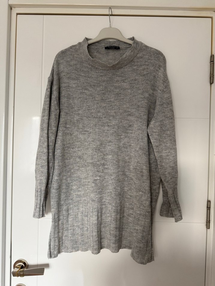 Gri renkli, örgü dokulu, yüksek yakalı ve uzun kollu triko. Keten kumaştan, midi boyda ve bol kesimdedir. Günlük kullanıma uygundur.