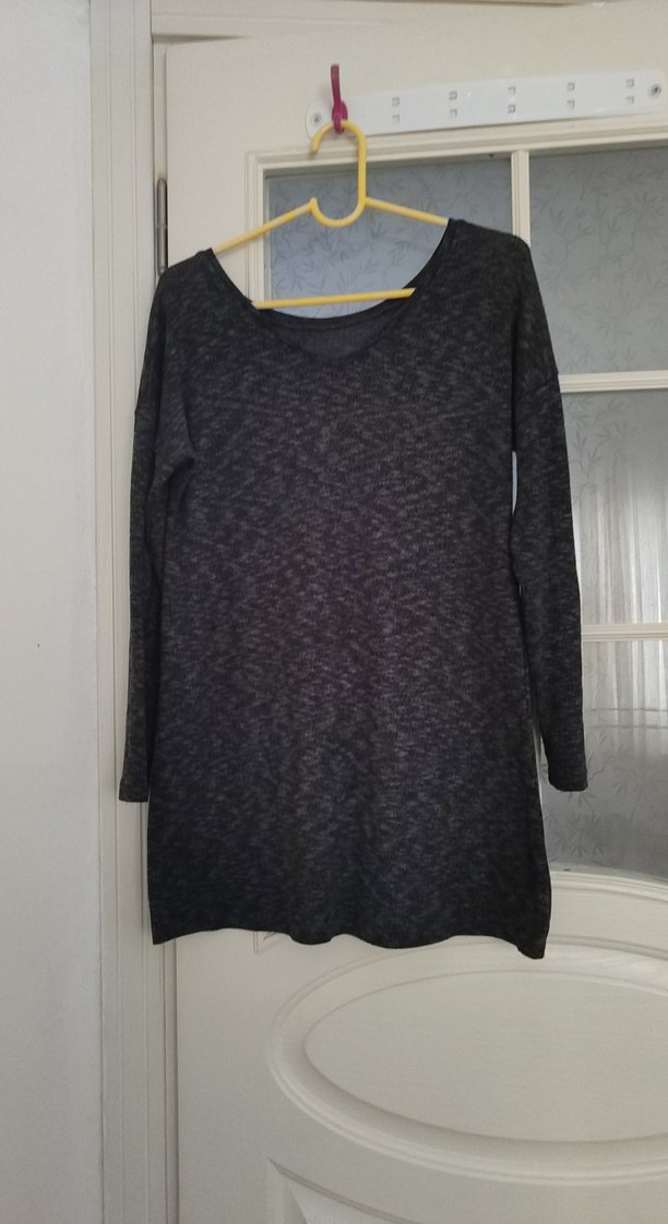 Gri renkte, örgü kumaştan yapılmış, uzun kollu ve salaş kesim kazak. Normal midi boyda ve yuvarlak yakalıdır.
