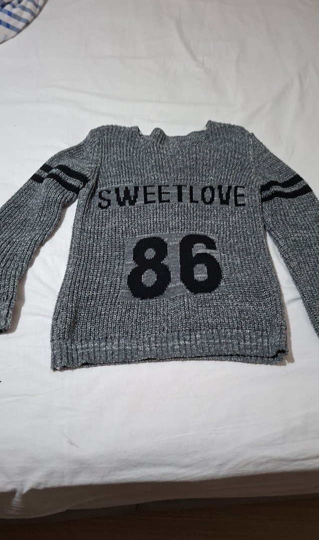 Gri renkli, uzun kollu ve bisiklet yaka örgü kazak. Önünde '86 SWEETLOVE' baskısı bulunur, rahat ve salaş kesimlidir.