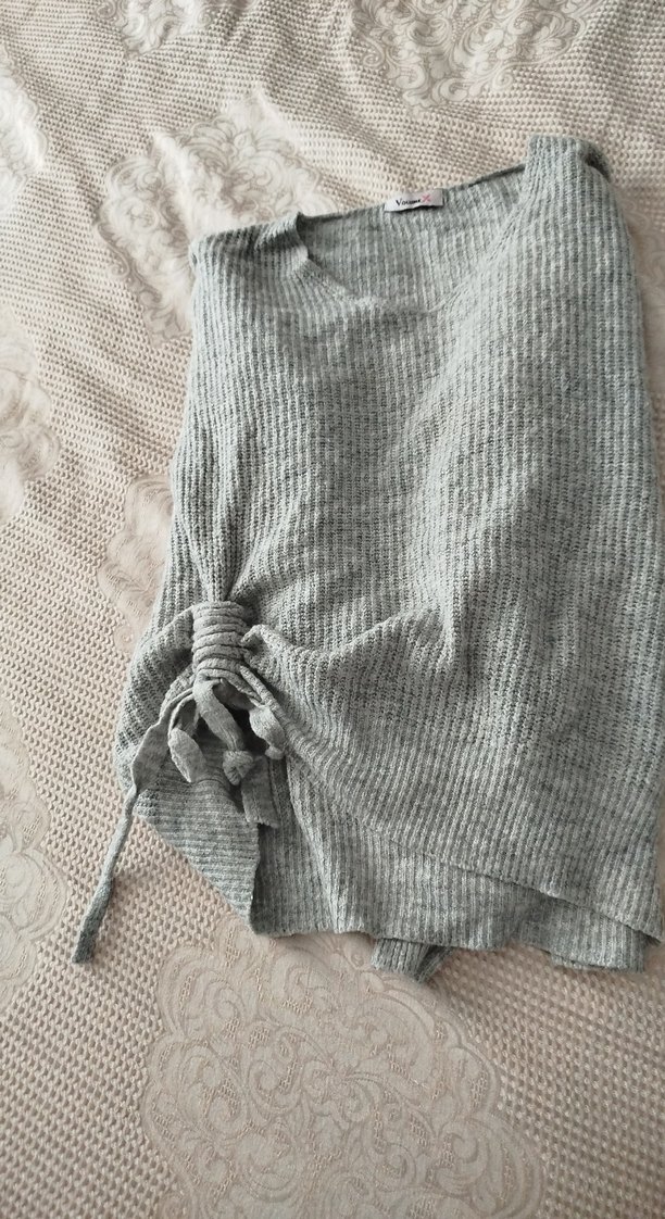 Gri renkli, örgü kumaştan yapılmış Ve yaka ve uzun kollu, rahat kesimli midi uzunlukta kadın kazak. Yanında bağlama detayı bulunur, günlük kullanıma uygundur.