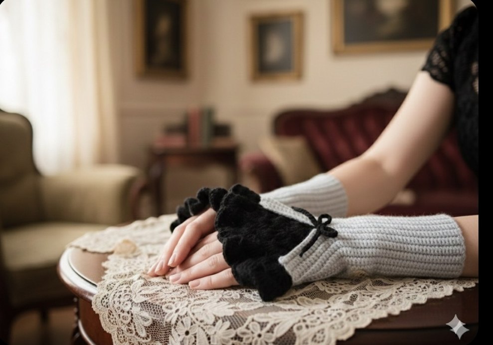 Gri örgü kadının eldiveni, siyah dantel detayları ve küçük fiyonk ile gotik ve bohem tarzları harmanlar. Yeni fotoğraftaki ürün gönderilecektir seni ben renkte kişiye özel örülmektedir