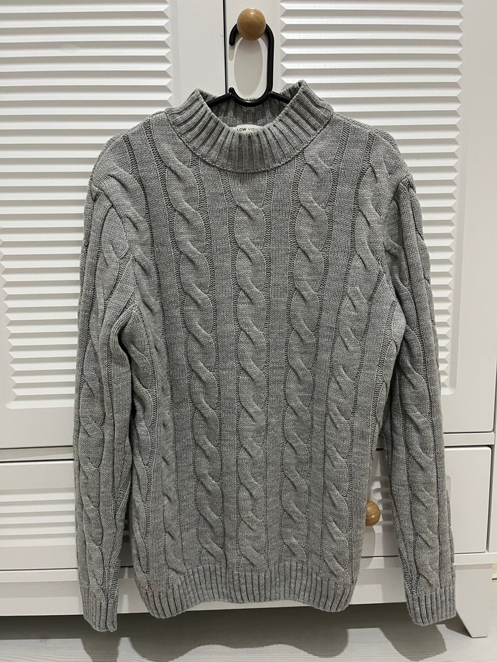 Bu gri örgü kazak, yarım balıkçı yaka ve uzun kolludur. Yumuşak örme kumaştan yapılmış, günlük kullanıma uygun rahat bir sokak stili sunar.