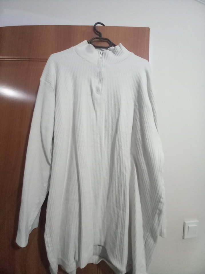 beyaz renkli, uzun kollu, yarım fermuarlı yüksek yakalı, gevşek kesim örgü kadın triko. Yumuşak keten kumaştan, günlük rahat kullanıma uygun. 54 beden